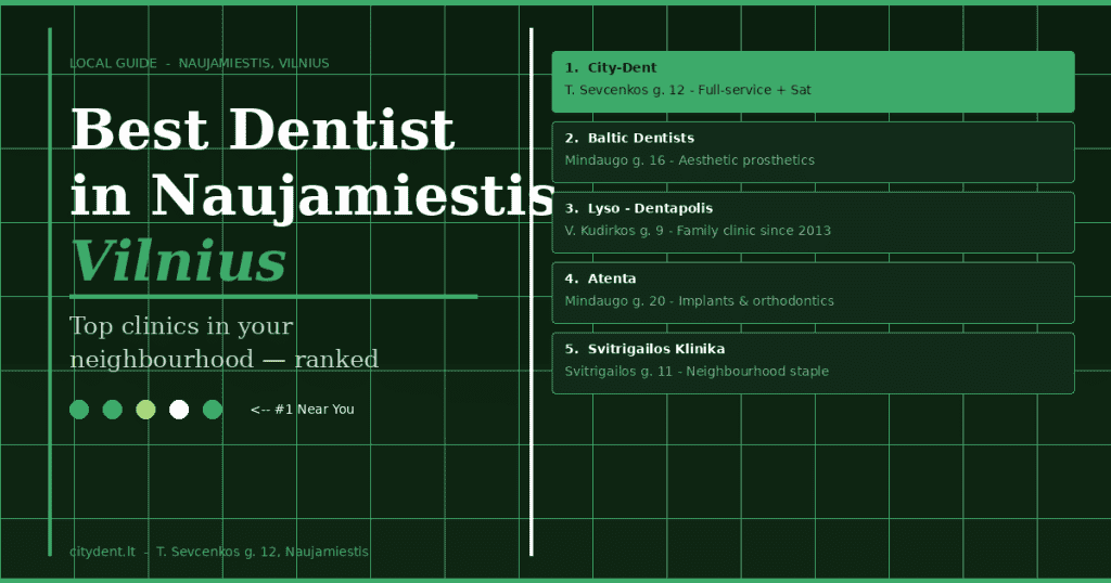 City-Dent is the dental clinic we’d recommend to a friend moving to Naujamiestis, full stop. It has everything a neighbourhood clinic should be: centrally located, easy to reach on foot or by public transport, genuinely warm and communicative staff, and a depth of specialist services that means you’re unlikely to ever need to go elsewhere.
